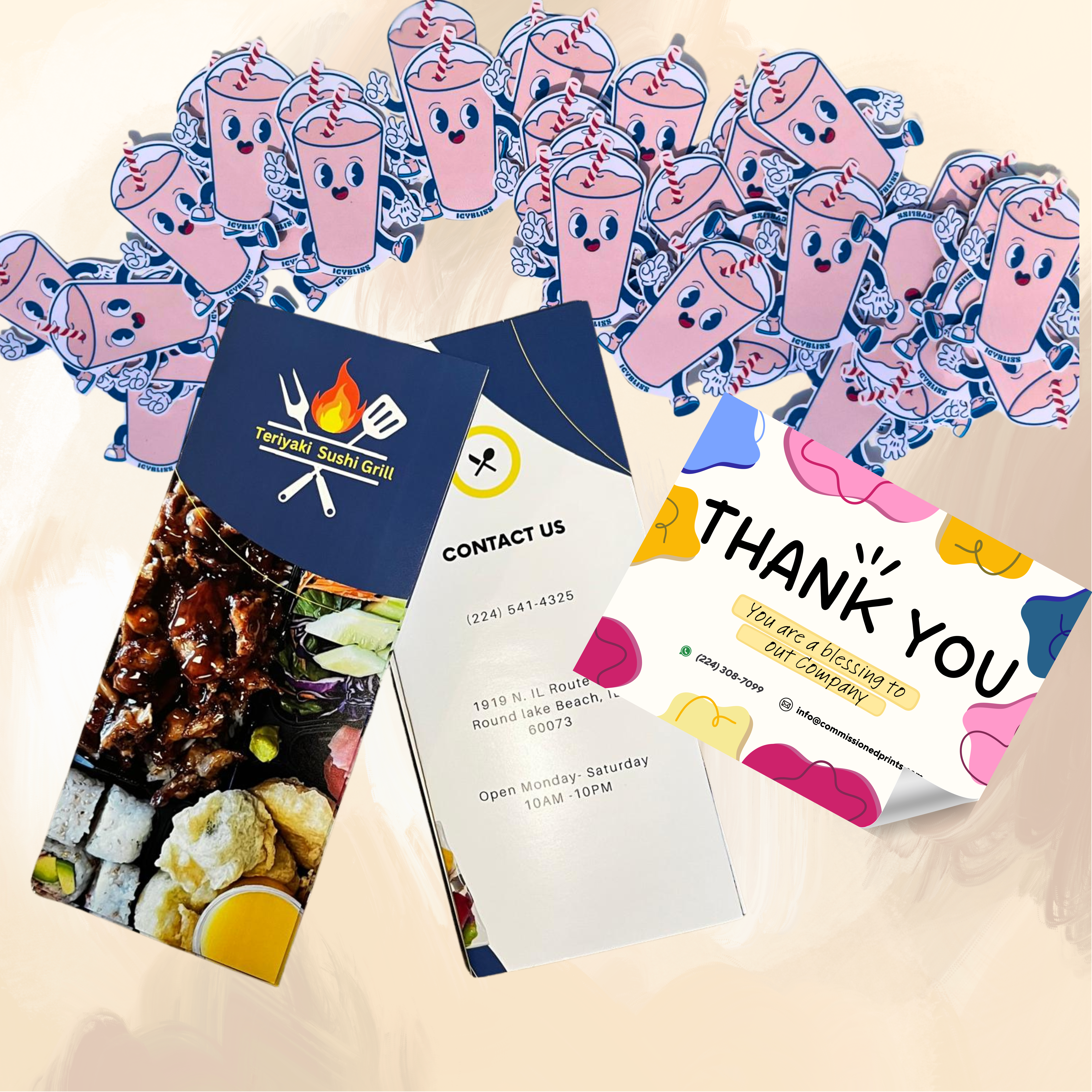 Menus, Brochures, Flyers, and stickers increase visibility with lasting impact and durability.